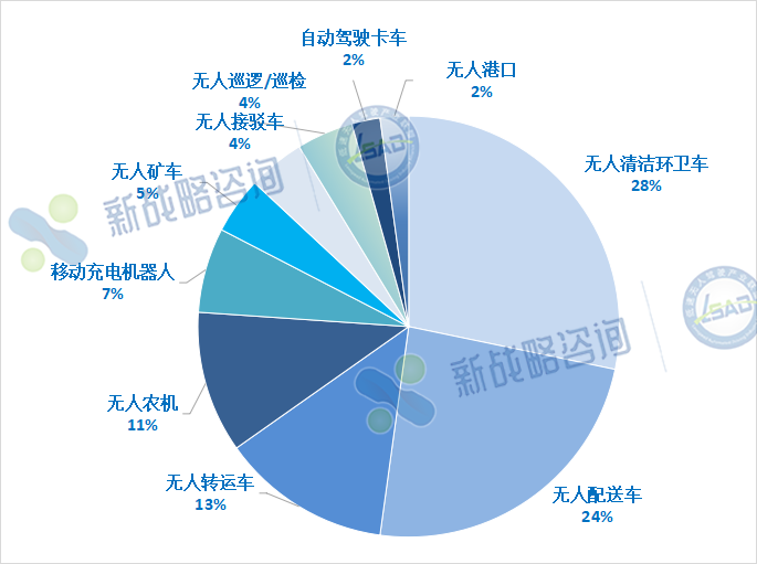 從產(chǎn)品類型來看,用于清潔環(huán)衛(wèi)場景的無人車新品數(shù)量最多,共有13款,占比28%,包括9款無人清掃環(huán)衛(wèi)車和3款清潔機(jī)器人以及1款水面無人駕駛清潔船;其次是無人配送領(lǐng)域新品11款,占比24%;園區(qū)物流轉(zhuǎn)運(yùn)車和無人農(nóng)機(jī)產(chǎn)品分別有6款和5款。