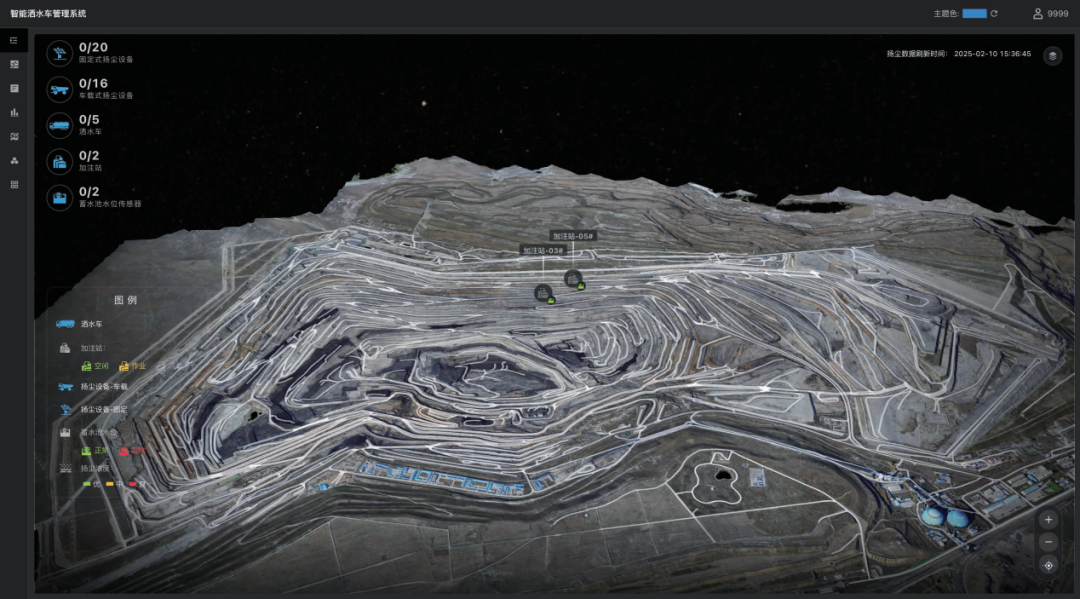 大屏監(jiān)控:實(shí)時(shí)展示礦區(qū)所有灑水車、加注站及揚(yáng)塵設(shè)備狀態(tài),細(xì)分至每條道路揚(yáng)塵指數(shù);