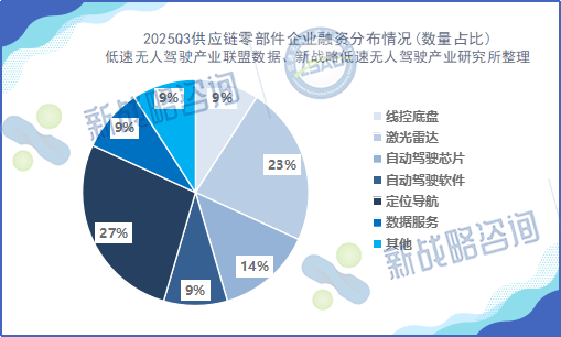 總體來看,2025年第三季度行業(yè)融資情況對(duì)比2024年同期,在統(tǒng)計(jì)的融資事件數(shù)量上相對(duì)持平,但披露的總?cè)谫Y金額略有增加;其中,在整車端持續(xù)落地快趨勢(shì)下,零部件端迎來資本補(bǔ)漲。雖然自動(dòng)駕駛卡車等仍是投資“壓艙石”,但激光雷達(dá)、自動(dòng)駕駛芯片、定位導(dǎo)航等關(guān)鍵零部件,正成為決定下一階段行業(yè)競(jìng)爭(zhēng)力的“杠桿點(diǎn)”。