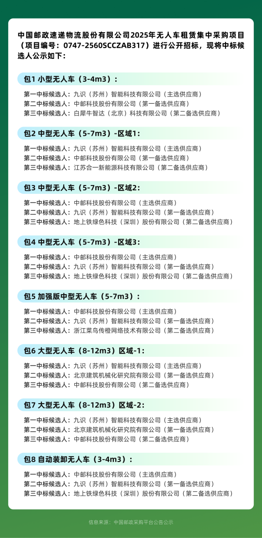 不止如此,在中國(guó)郵政近期公布的全球最大規(guī)模無(wú)人車租賃集采項(xiàng)目結(jié)果中,九識(shí)智能(Zelos)包攬?jiān)擁?xiàng)目全部標(biāo)段,并在第1、2、6、7四個(gè)標(biāo)段中以絕對(duì)優(yōu)勢(shì)確定為主供應(yīng)商,成為中國(guó)郵政無(wú)人運(yùn)力核心合作伙伴,實(shí)現(xiàn)全球頂尖科技力量與中國(guó)“國(guó)家隊(duì)”物流體系中的深入嵌入。