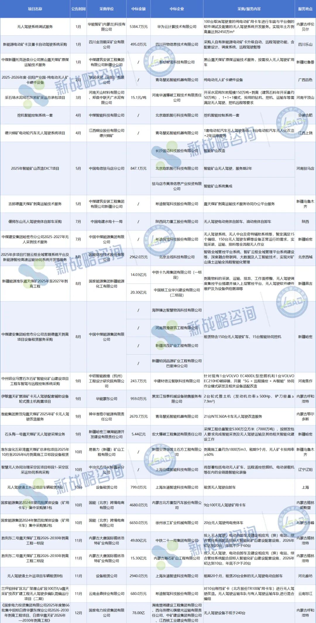 除該項(xiàng)目外,新戰(zhàn)略低速無人駕駛?cè)襟w也觀察到,今年以來,礦區(qū)在無人駕駛設(shè)備的投入上持續(xù)增加,多個大型礦山項(xiàng)目在招標(biāo)或建設(shè)規(guī)劃中均明確引入了無人化運(yùn)輸與作業(yè)方案。據(jù)新戰(zhàn)略低速無人駕駛產(chǎn)業(yè)研究所統(tǒng)計(jì),截至目前,2025無人礦區(qū)領(lǐng)域中標(biāo)項(xiàng)目近40項(xiàng),累計(jì)標(biāo)的金額超185億元。在安全生產(chǎn)、效率提升及成本控制的綜合驅(qū)動下,礦山智能化、無人化轉(zhuǎn)型步伐明顯加快。(延伸閱讀:內(nèi)蒙古一礦區(qū)超億元無人駕駛運(yùn)輸項(xiàng)目即將開標(biāo)!)