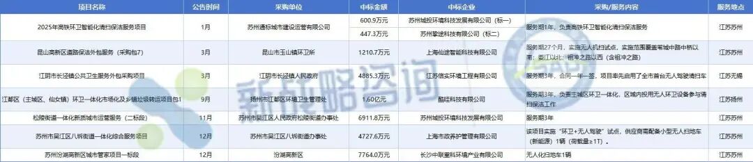 江蘇省2025年無(wú)人環(huán)衛(wèi)領(lǐng)域部分大額中標(biāo)項(xiàng)目