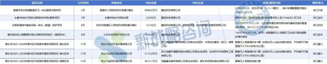 浙江省2025年無(wú)人環(huán)衛(wèi)領(lǐng)域部分大額中標(biāo)項(xiàng)目