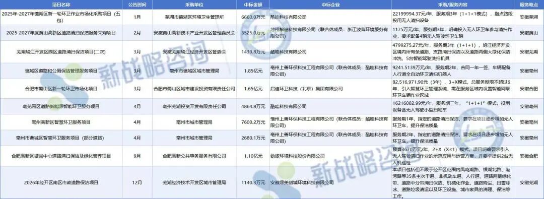 安徽省2025年無(wú)人環(huán)衛(wèi)領(lǐng)域部分大額中標(biāo)項(xiàng)目